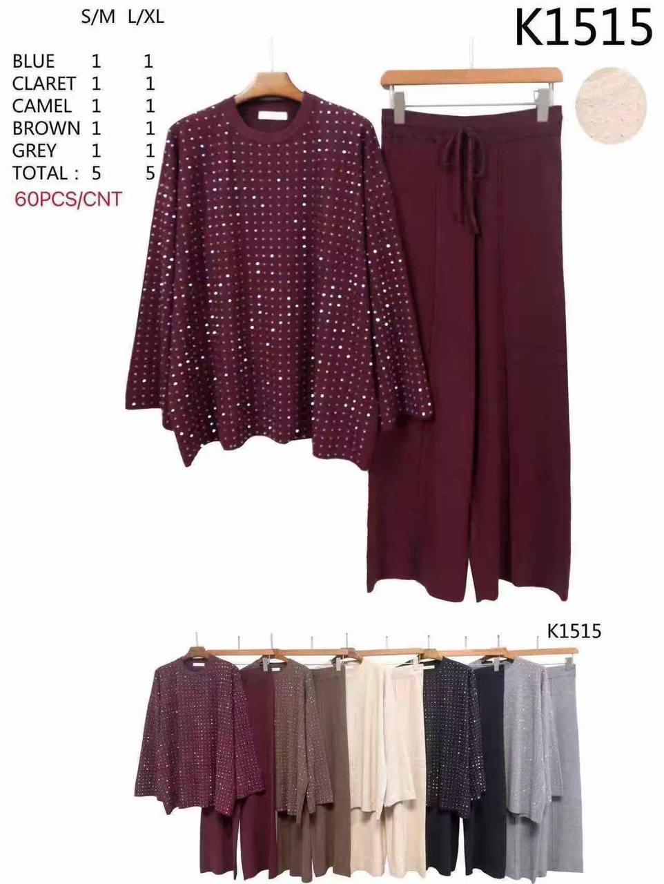 A knit suit with thermal rhinestones and trousers with drawstrings.