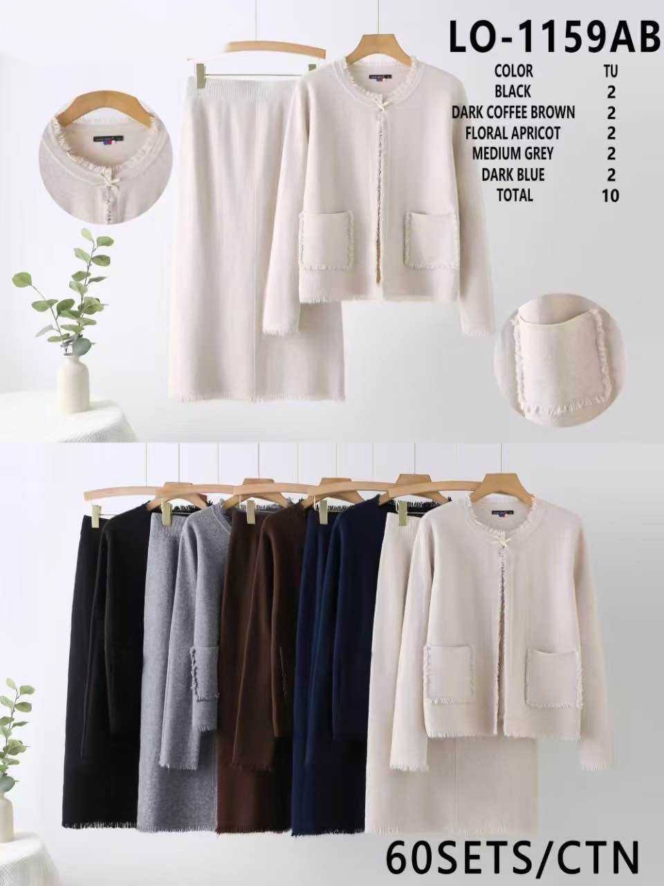 A knit suit featuring a tie-front cardigan with pockets and loose trousers with an elastic waistband.