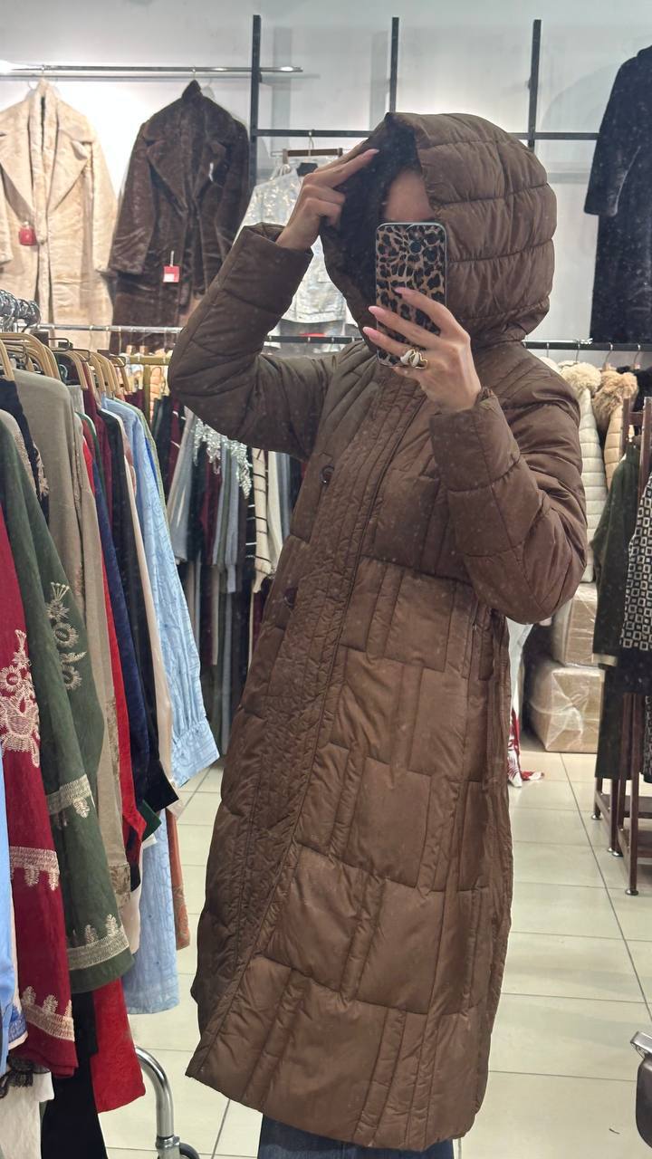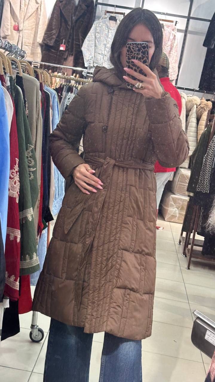 A quilted raincoat. Features a hood, pockets, and comes with a belt. Available in various colors.