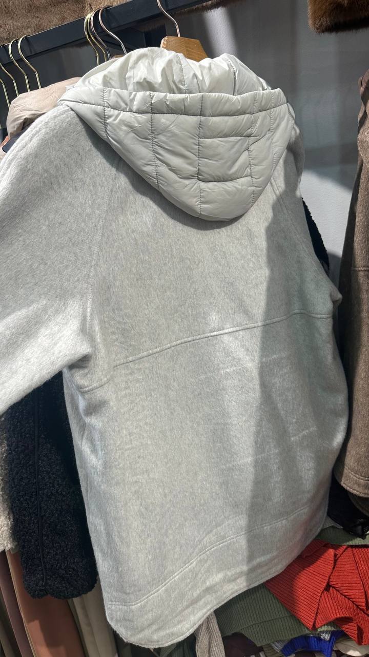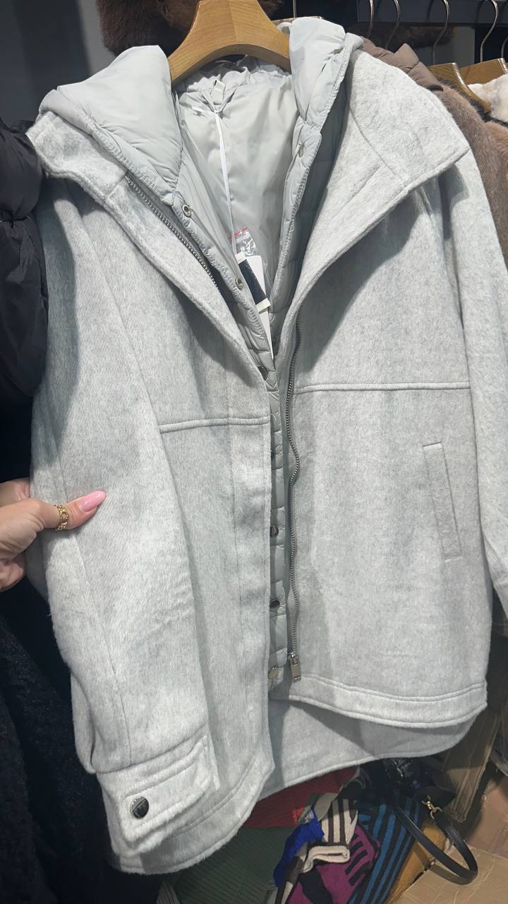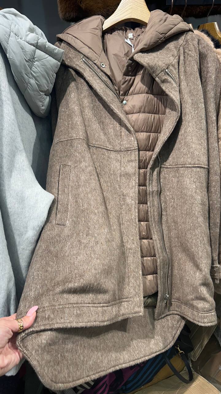 A two-piece set: a quilted vest underneath, with a long drape bomber jacket on top.