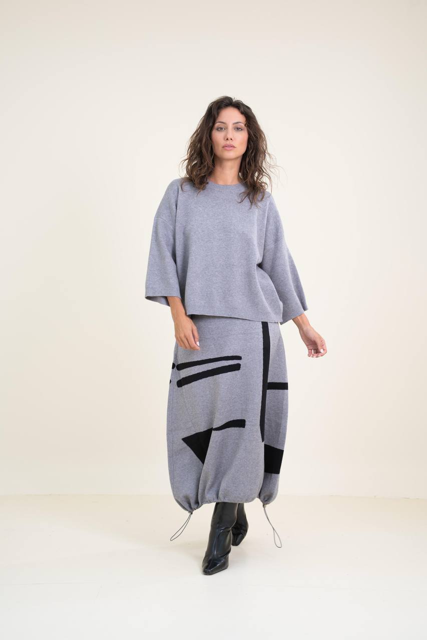 Knitted suit with skirt featuring adjustable elastic hem. Viscose fabric